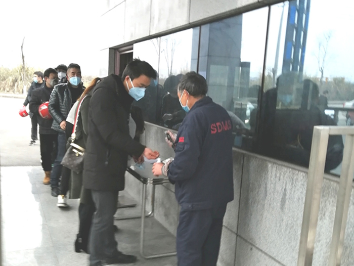 ??????復工首日始,全廠進行全面消毒,所有員工依次排隊進行體溫檢測、登記、消毒等、并再次每人發(fā)放口罩。